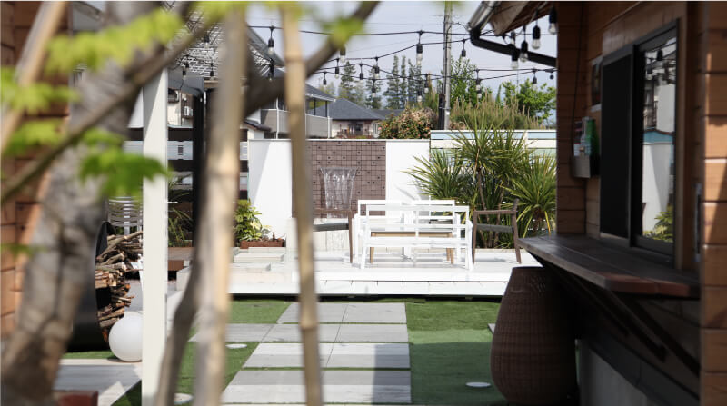 間口が6M、出幅3Mと大きなウッドデッキの上ではお子様がプールで遊んだり、家族や友人とバーベキューしたりと使い方は色々。デッキ下にはバーベキューコンロが置けるオリジナルのステップ(踊り場)を設置。