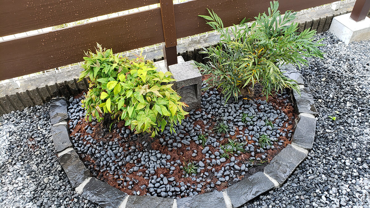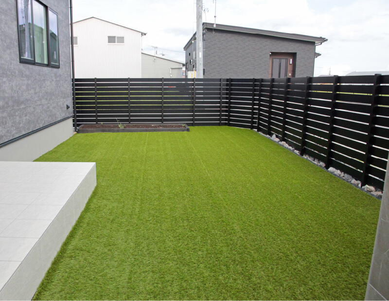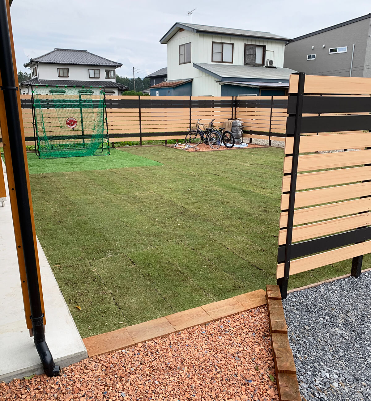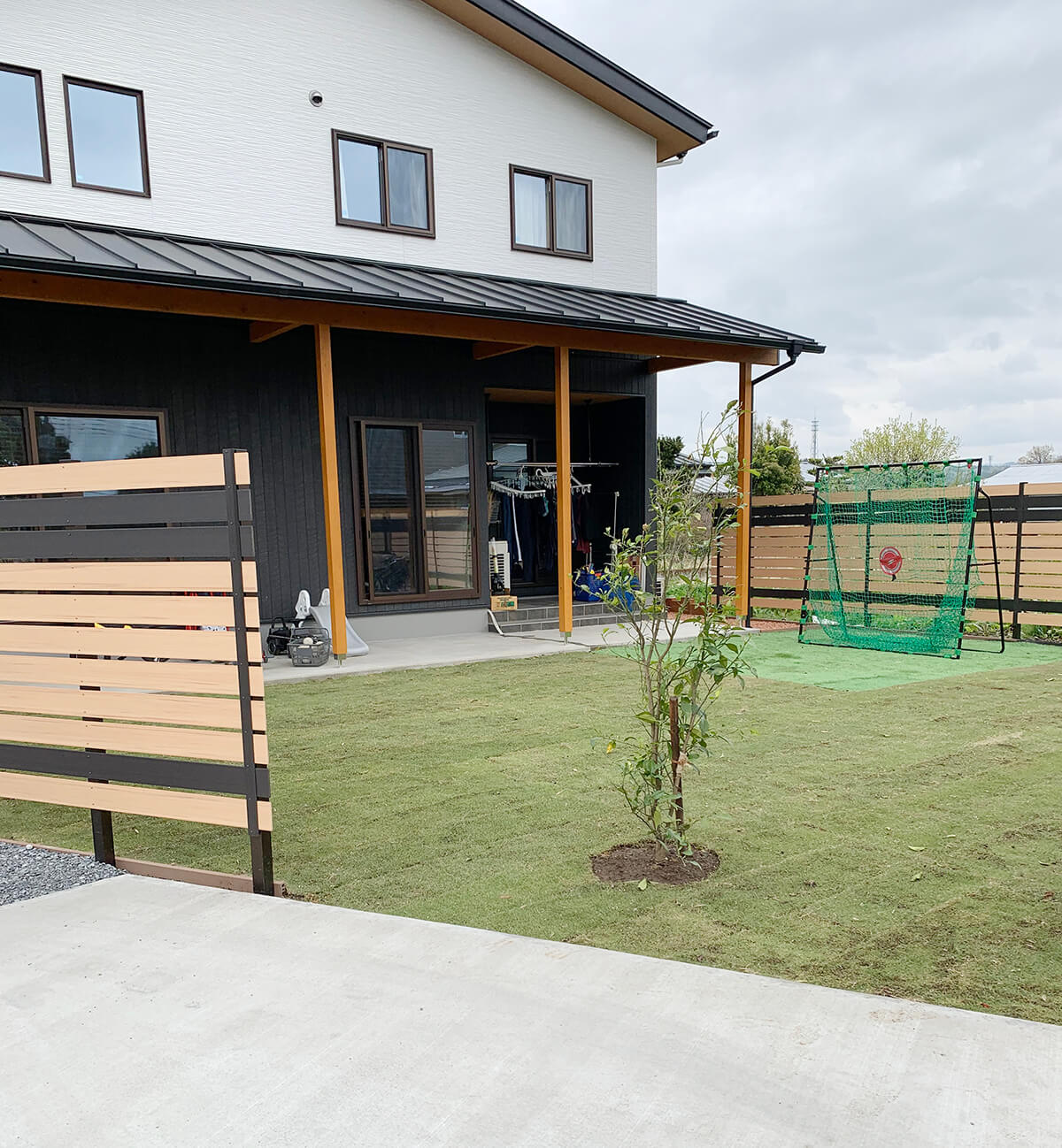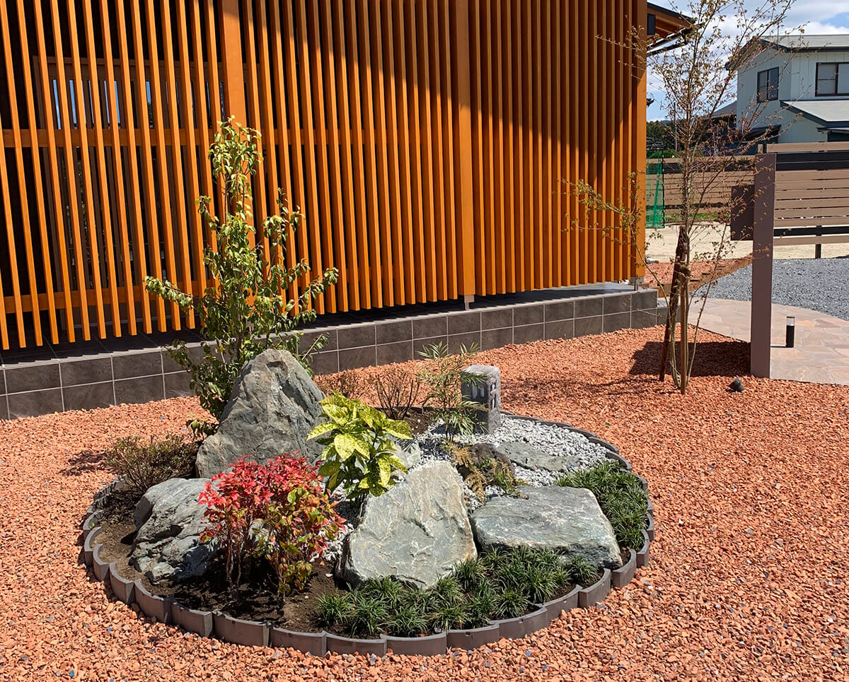 天然芝を敷いた中庭を囲う木調の目隠しフェンス。 石貼りの玄関アプローチに和を感じさせる塗り壁。訪問した方に一瞬の癒しを与える坪庭。 季節を感じていただける植栽。ライトアップで夜に家族を温かく迎える演出もしています。 広い建物廻りには防草シートの上に再生材の瓦チップを敷いて明るい雰囲気に。 瓦チップは色落ちしない上、直射日光の「照り返し抑制効果」と、地面からの温度上昇を和らげる「打ち水効果」もあります。