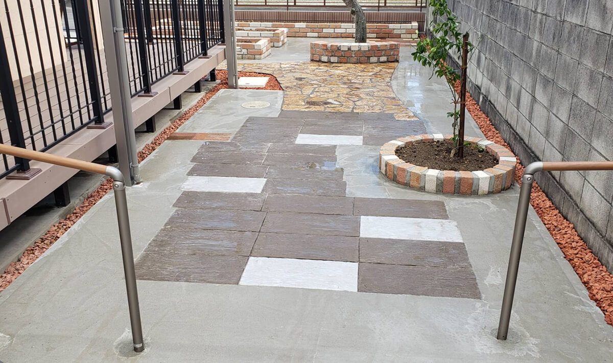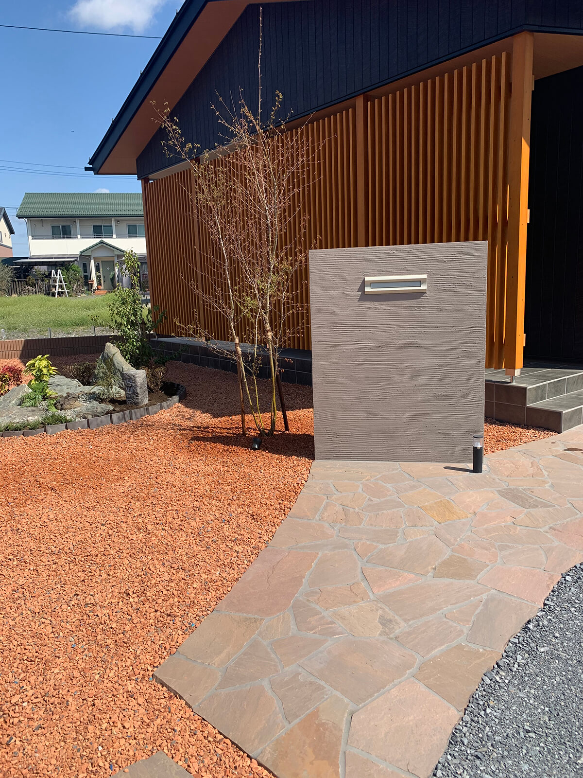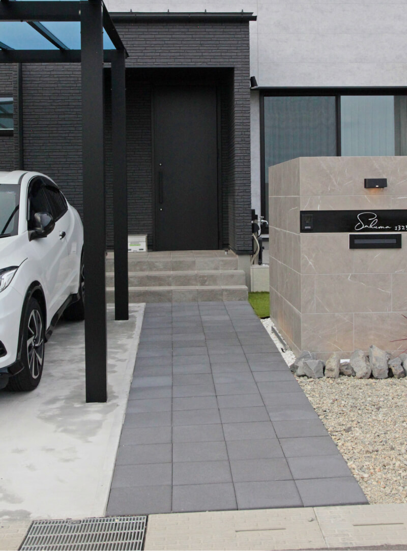建物との調和、車を降りてから郵便物を取り、玄関に入るまでの動線を考慮して設計・提案した玄関アプローチ。