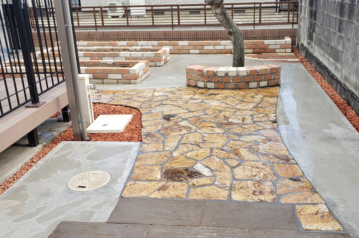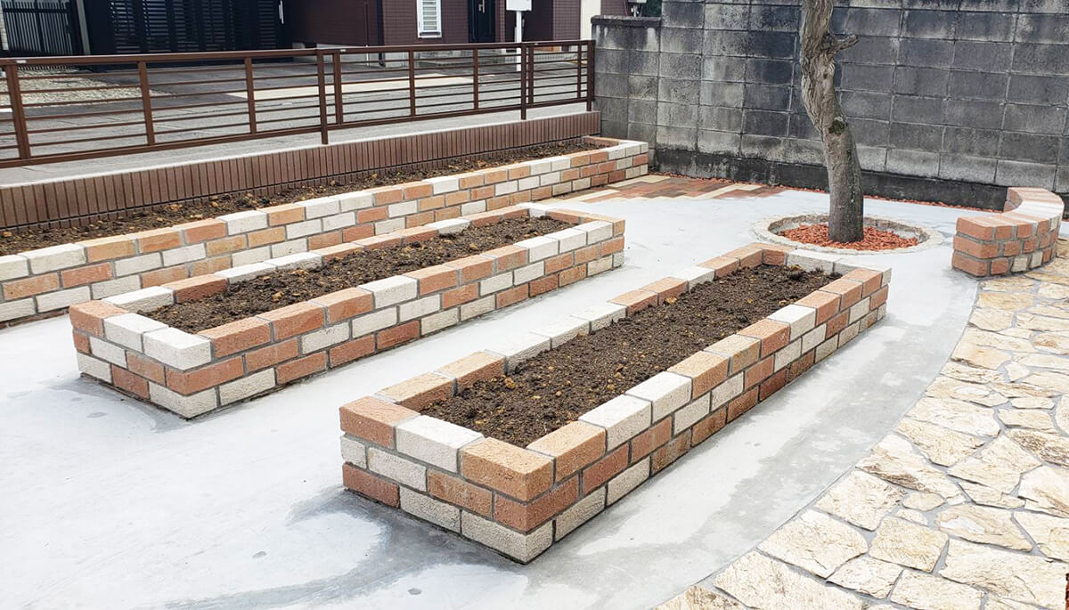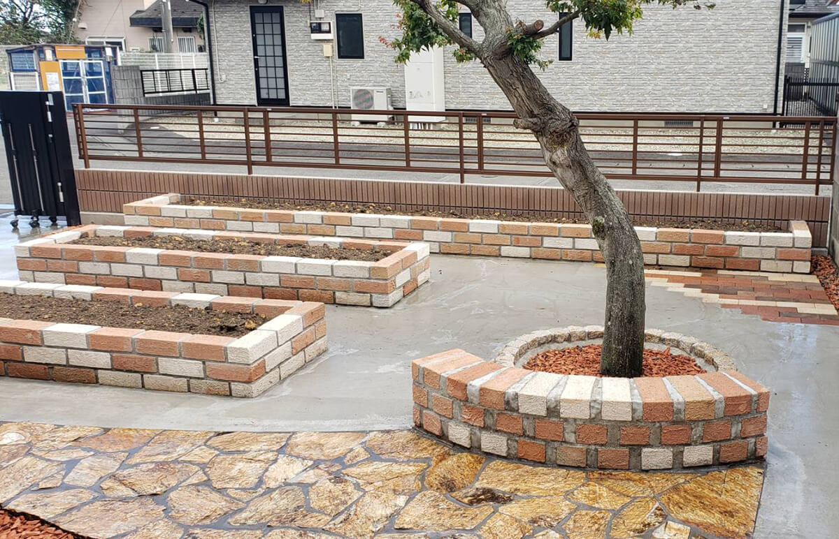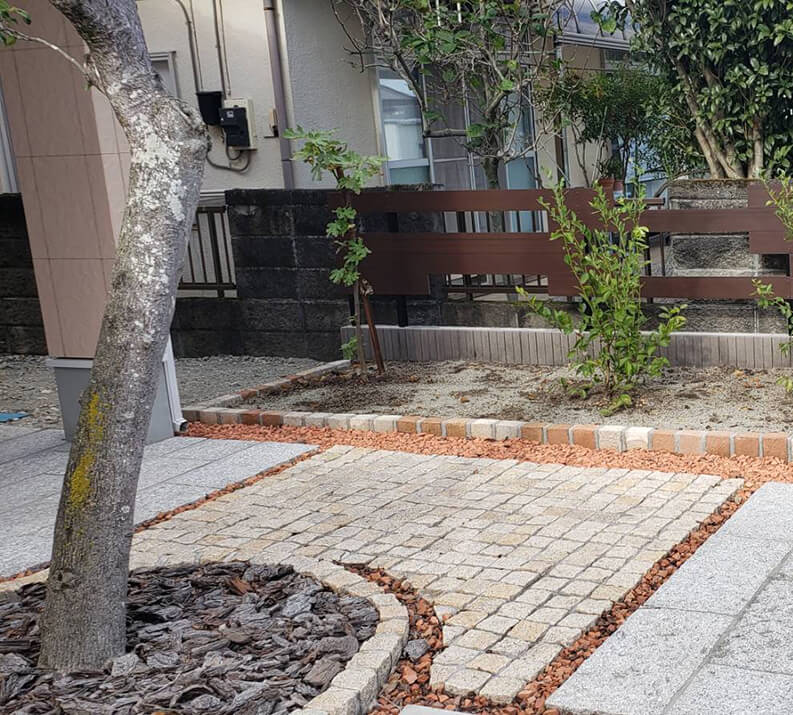 花壇をレンガで作ることで洋の雰囲気を出し、建物との調和を崩さないように、和の雰囲気を出す石貼りのアプローチを選択。オリジナルなフェンスの貼り方で個性も演出。和風洋風の組み合わせで楽しんでいただける庭となりました。